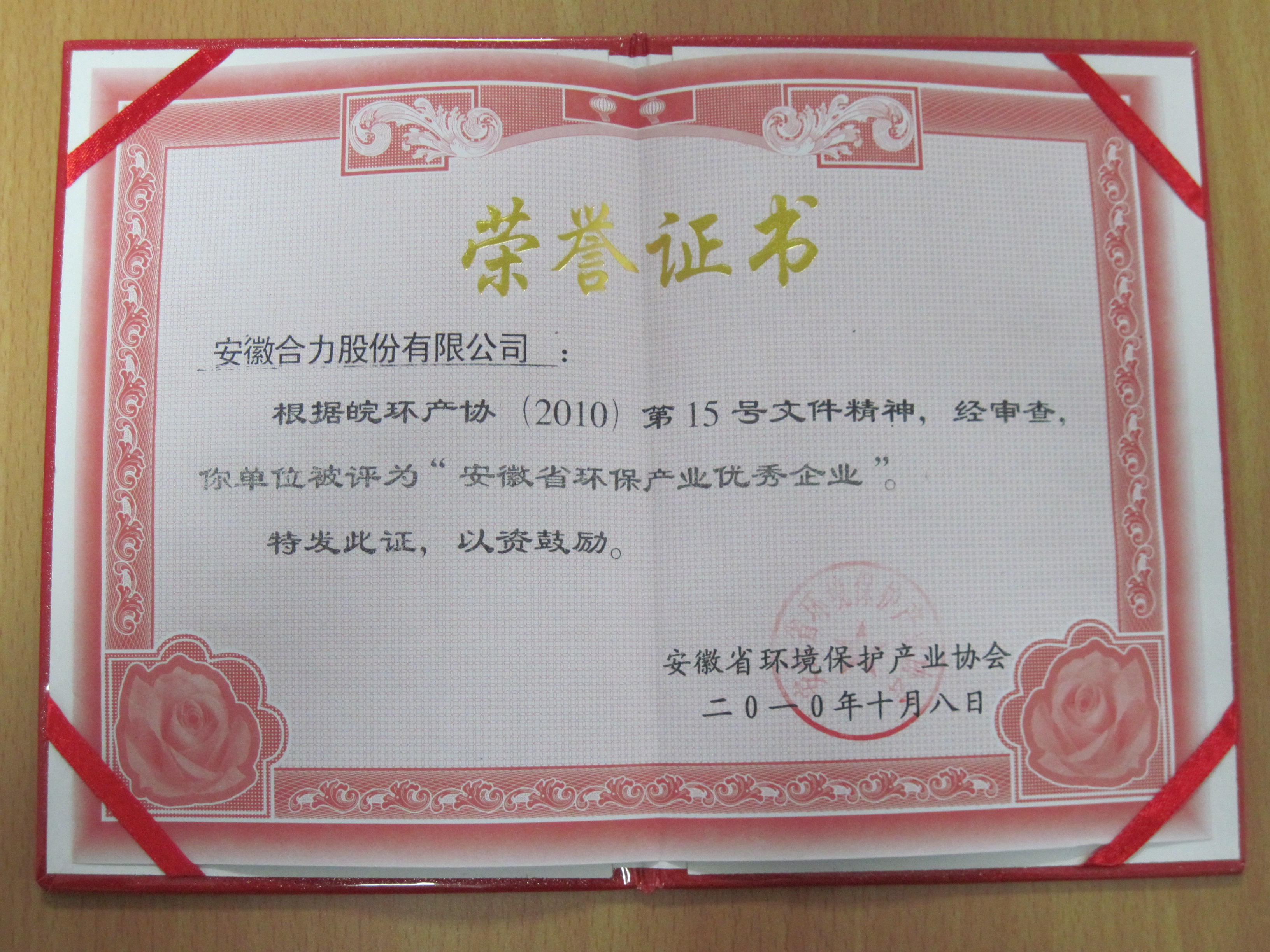 2010 安徽省环保企业优异企业证书