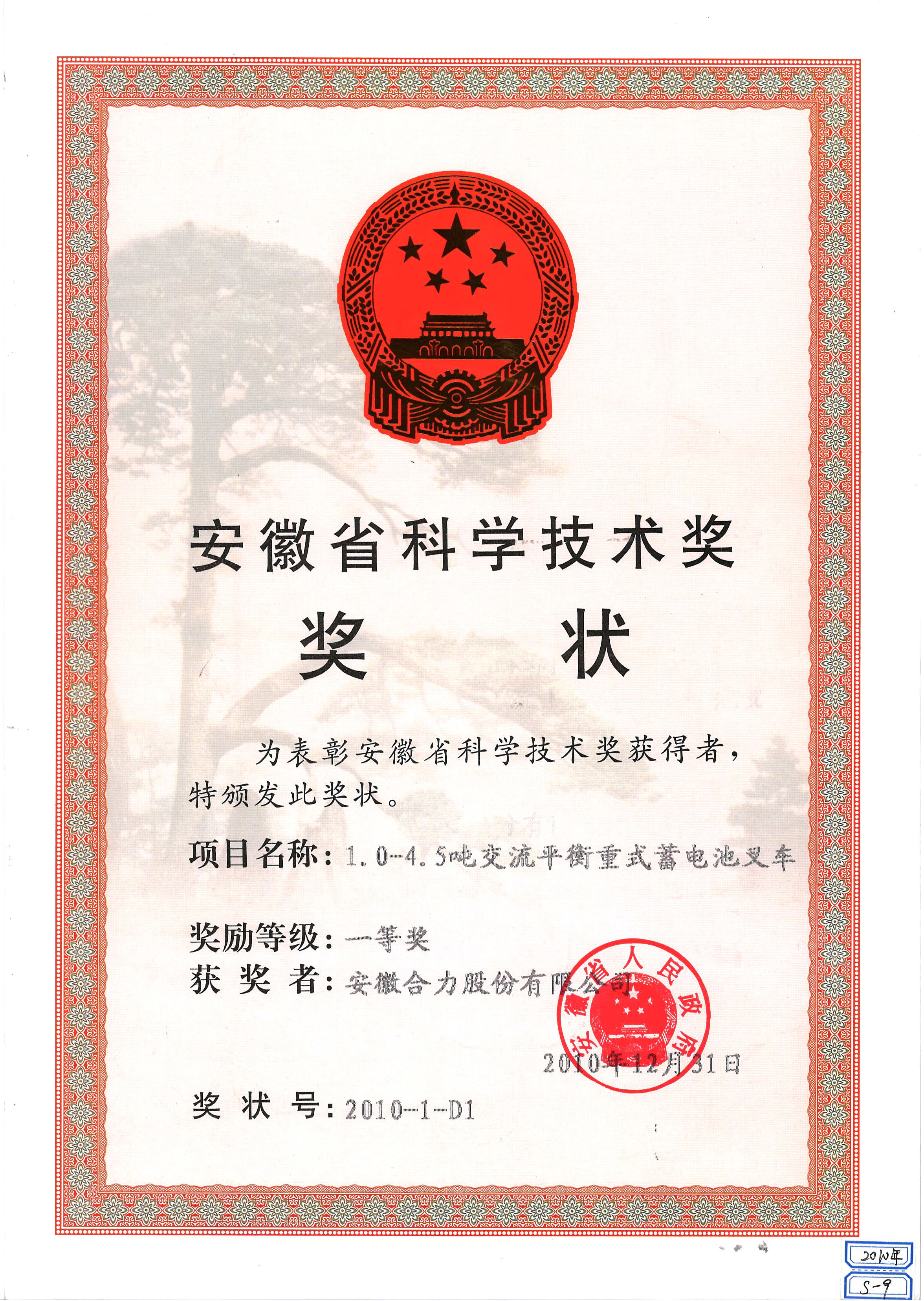 2010 安徽省迷信手艺奖奖状:1.0-4.5吨交换均衡重式蓄电池叉车一等奖